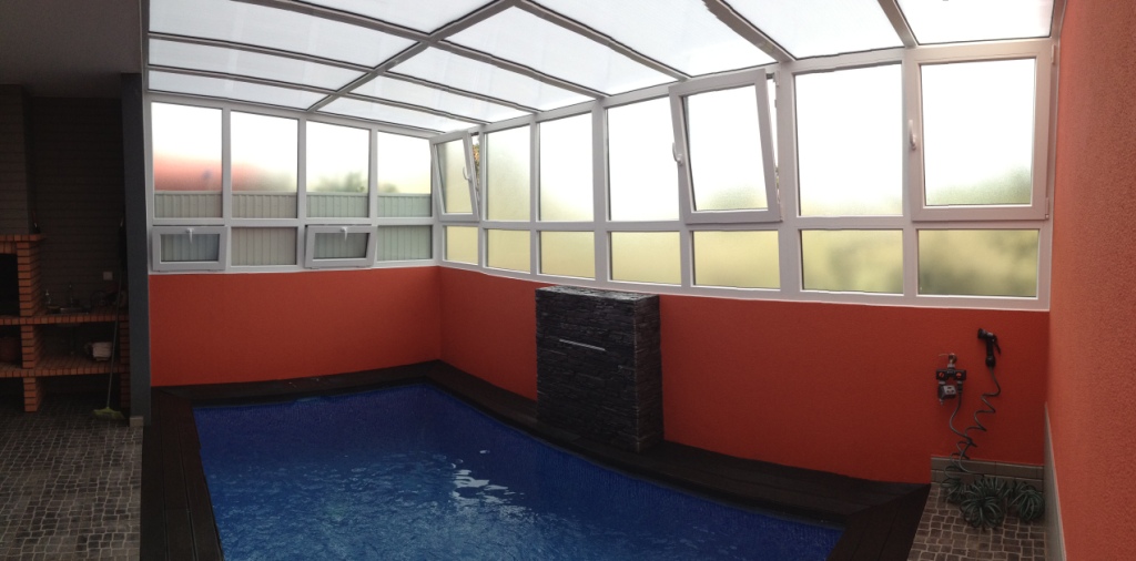 Projeto executado com caixilharia PVC Cortizo com acabamento exterior a 7016 e interior em branco, vidro duplo Guardian Sun, cobertura em alumínio Cor 3000 RPT lacado branco com chapa policarbonato alveolar opal 20mm.